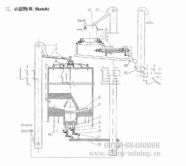 MF生料均化庫采用分配器和六根斜槽呈輻射狀卸入庫內,基本形成水平料層,庫底是錐形,略向中心頃斜,中部有一中心混合室,中心室與庫壁之間的庫底分為6-14個充氣區,每區設3條充氣斜槽和1個卸料孔。卸料時向兩相對區輪流充氣,在卸料口上方出現多股漏斗凹陷,漏斗沿直徑排成一列,隨充氣的交換而旋轉角度,這樣不但產生重力混合,而且生料從庫底卸入中心室后,中心室底部連續充氣,使生料又獲一次均化,由于這種庫的均化原理是以料流漏斗重力混合為主要手段,所以電耗極省,能耗僅為0.432-0.576kwh/t,均化值可達7-10,該系統具有高效節能,基建投資低和操作管理簡便等優點。